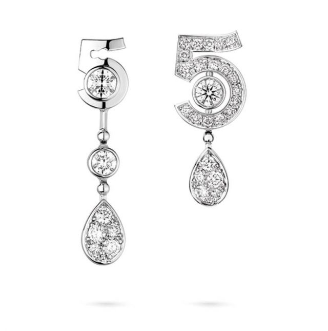 رُصّعت أقراط ETERNAL N°5 المصنوعة من الذهب الأبيض عيار 18 قيراطاً بالماس. يكشف أحد الأقراط عن تصميم الرقم 5، بينما يكشف الآخر عن قطرة مرصوفة بالماس، ويمكن ارتداؤه قصيراً أو طويلاً.