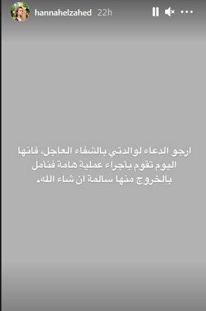ولم تفصح هنا عن أي تفاصيل تخص عملية والدتها؛ أو حالتها الصحية، فقط اكتفت بطلب الدعاء لها.