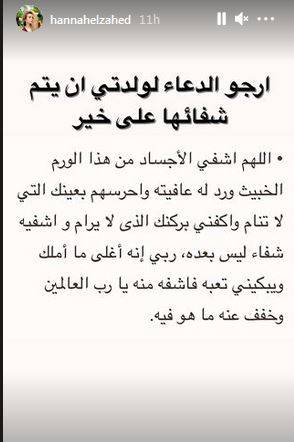 كما أعادت الفنانة الشابة فرح الزاهد نشر منشور شقيقتها هنا، لتطلب من جمهورها أيضاً الدعاء لوالدتها.
