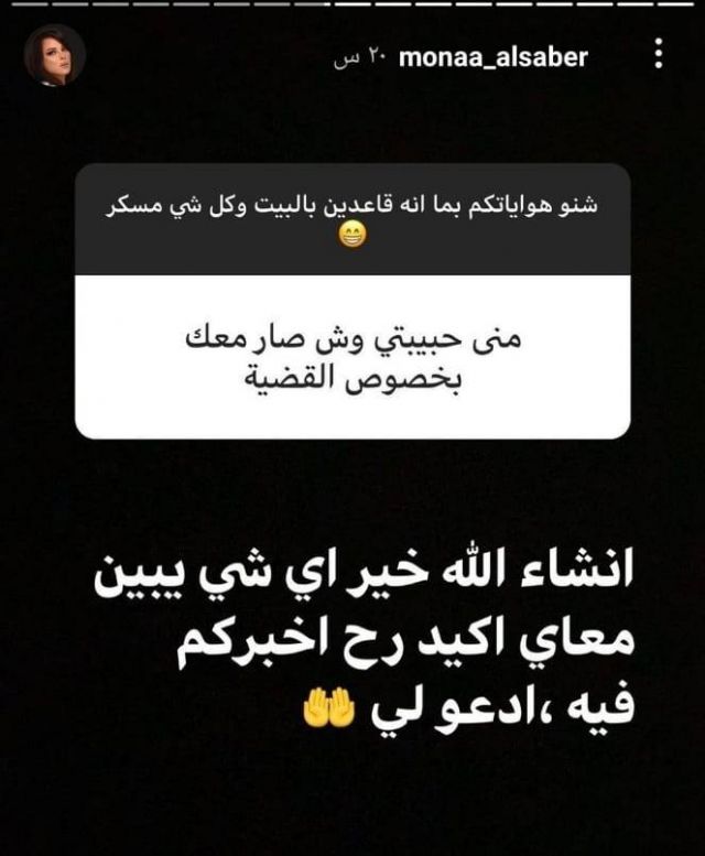 وردّت السابر على أسئلة حول قضيتها مع ابنتها ومصيرها بعد انتهاء المهلة الثانية لدفع المبلغ، قائلةً: "إن شاء الله خير، أي شيء يبين معي، أكيد راح أخبركم فيه، ادعولي".
