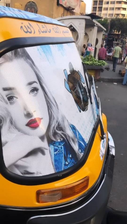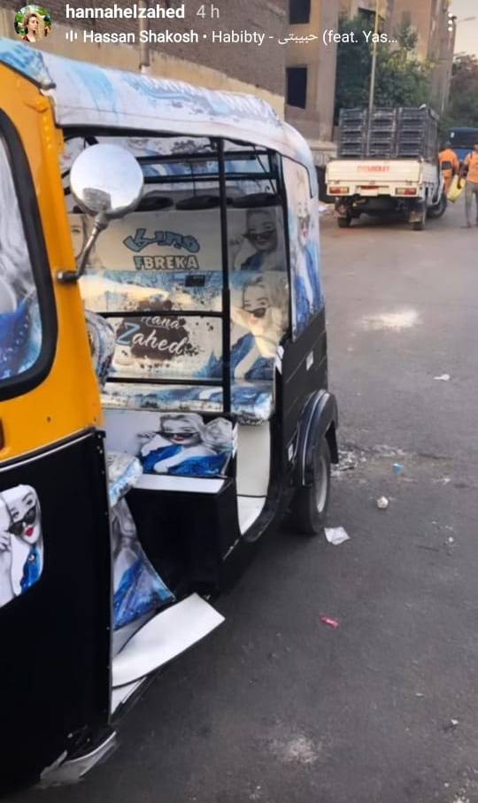ونشرت هنا عبر خاصية القصص القصيرة الملحقة على حسابها بـ"إنستغرام" صور لـ"التوك توك" الذي تزين بصورها في كل مكان، وكتبت معبرة عن سعادتها قائلة: "والله اتبسط جدا".