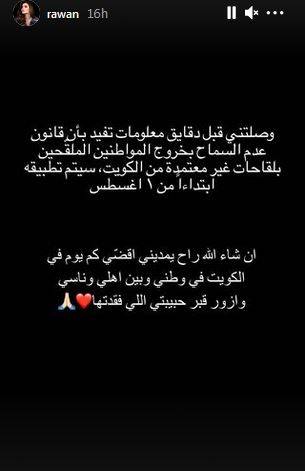 بعدها، قالت بن حسين في منشور آخر: "وصلتني قبل دقائق معلومات تفيد بأن قانون عدم السماح خروج المواطنين الملقحين بلقاحات غير معتمدة من الكويت، سيتم تطبيقه ابتداء من 1 آب (اغسطس). إن شالله راح اقضي كم يوم في وطني وبين أهلي وأزور قبر حبيبتي اللي فقدتها".