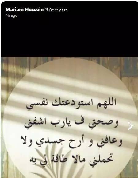 واكتفت مريم حسين بإحداث ضجة بين متابعيها من دون أن تكشف أي معلومات عن حالتها الصحية، وما إذا كانت تتلقى العلاج في المستشفى، أو كانت في غرفة العزل لحمايتها وحماية المحيطين بها... وطلبت من خلال رسالة لمتابعيها الدعاء لها قائلةً: "اللهم إني أستودعك نفسي وصحتي فيارب اشفني وعافني وأرح جسدي ولا تحمّلني ما لا طاقة لي به"... وهو ما تفاعل معه عدد كبير من متابعيها الذين تمنّوا لها الصحة وأن تكون وعكة بسيطة وتزول.