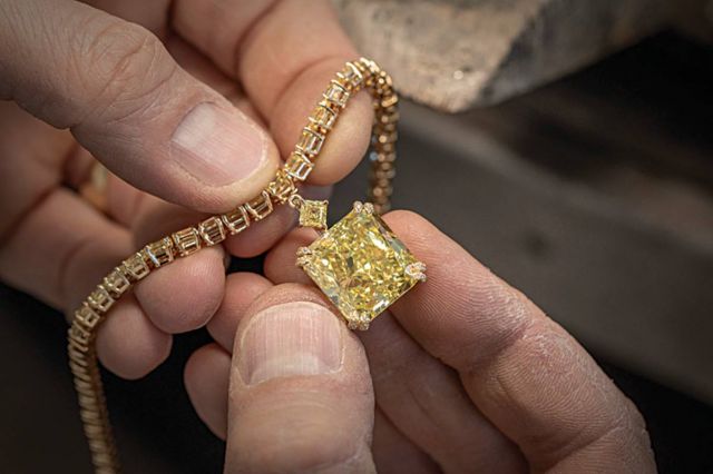 ومن بين المصادر اللامحدودة التي تُلهم عالمها المذهل، اختارت كارولين شوفوليه ببراعة مجموعة كاملة من الموارد الإبداعية في هذه التشكيلة الجديدة من مجموعة Red Carpet التي كشفت اليوم عن أولى روائعها. ويتميز أول تصميم ضمن المجموعة بطوق يلتفّ فيه الألماس الأصفر حول العنق بروعة أرستقراطية، ويعاود الطوق التفافه مرة أخرى فيبدو كهالة ثانية من الضوء تتدلّى لتزيّن الصدر. ويتكلّل الطوق بدرّة استثنائية وفريدة في روعتها تتجلّى في ألماسة بلون أصفر فاقع ووزن 30,68 قيراطاً تجسّد بمفردها أبّهة هذه التحفة النفيسة ورونقها.
