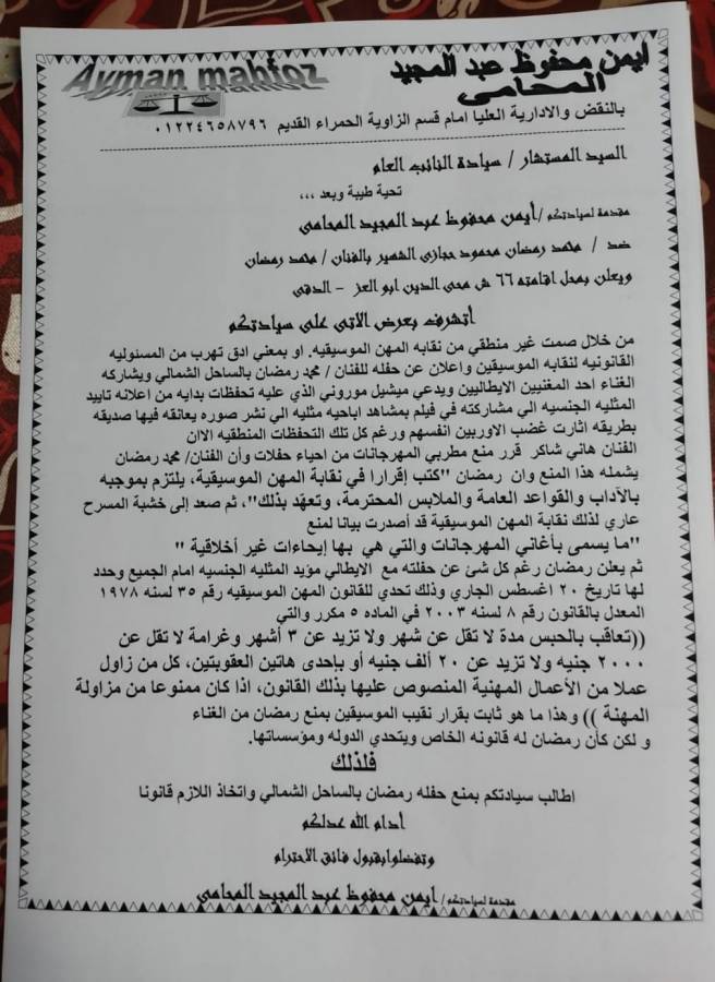 وقال "محفوظ" فى بلاغه، أنه هناك صمت غير منطقي من نقابة المهن الموسيقية تجاه إعلان عن حفل للفنان محمد رمضان بالساحل الشمالي يشاركه الغناء أحد المغنيين الإيطاليين.