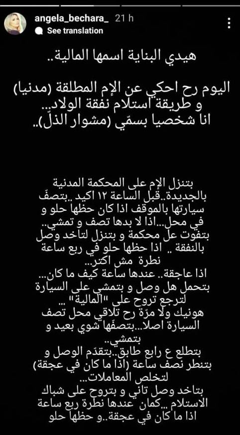 وعبّرت بشارة عن غضبها من طريقة التعامل مع الأم المطلّقة في لبنان، بشأن الحصول على النفقة، من خلال صور نشرتها عبر خاصية "الستوريز" الملحقة بحسابها في تطبيق "إنستغرام"، مؤكدةً أنها تعاني الذل والإهانة كل شهر للحصول على نفقة ابنتيها ميشال وميلانا... ونشرت صورة لبناء وعلّقت عليها قائلةً: "هيدي البناية اسمها المالية... اليوم رح احكي عن الأم المطلّقة مدنياً وطريقة استلام نفقة الأولاد... أنا شخصياً بسميه مشوال الذل".
