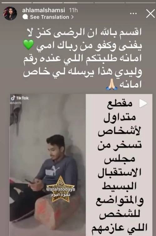 وأعادت النجمة الاماراتية نشر مقطع الفيديو عبر خاصية الستوريز بحسابها على انستغرام وكتبت على صورة الشاب: "أقسم بالله أن الرضا كنز لا يفنى وكفو من رباك أمي.. أمانة طلبتكم اللي عنده رقم وليدي هذا يرسله لي خاص أمانة".