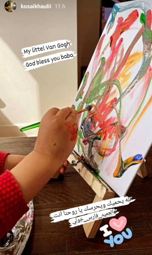 استعرض النجم السوري قصي خولي مجدداً موهبة طفله العميد فارس المميّزة في الرسم، من خلال صورة نشرها عبر خاصية "الستوريز" الملحقة بحسابه في تطبيق "إنستغرام".