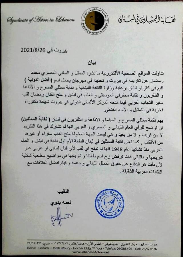 وجاء في بيان إعلامي أصدرته النقابة: "تداولت المواقع الصحافية الإلكترونية ما نشره الممثل والمغني المصري محمد رمضان عن تكريمه في بيروت، وتحديداً في مهرجان يحمل اسم "أفضل الدولية"، أُقيم في كازينو لبنان برعاية وزارة الثقافة اللبنانية ونقابة ممثلي المسرح والإذاعة والتلفزيون ونقابة محترفي الموسيقى والغناء في لبنان، ومُنِح الفنان لقب "سفير الشباب العربي"، فيما منحه المركز الألماني الدولي في بيروت شهادة دكتوراه فخريّة في التمثيل والأداء الغنائي".