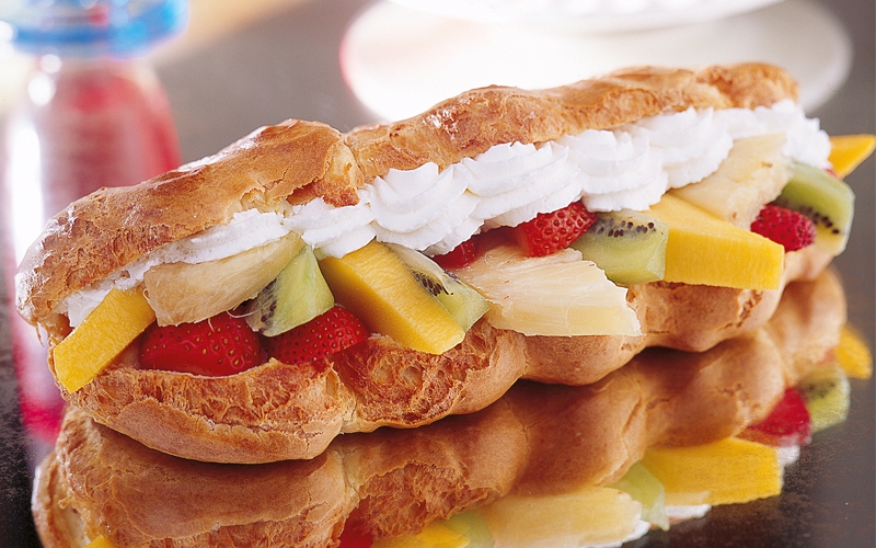 يحشى العجين المخبوز بالكريما المخفوقة ومختلف أنواع الفاكهة الاستوائية مثل الأناناس والكيوي والفراولة والمانجا (أنظري إلى الصورة).