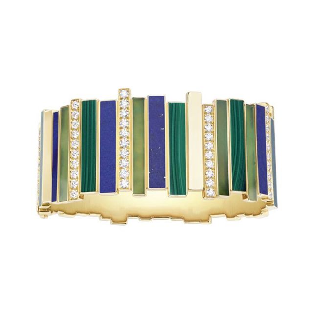 الهندسة غير الاعتيادية لتصميم "جيم ديور" Gem Dior تقدّم لنا مجموعة لا تُقاوَم من المجوهرات. تصاميم النجمة هي خاتم وسوار من الذهب الأصفر مع حلقات غير متراصفة بشكل مثاليّ ومتعمّد من الأحجار الكريمة والألماس من أجل إعطاء انطباع متموّج للألوان الزرقاء والخضراء.