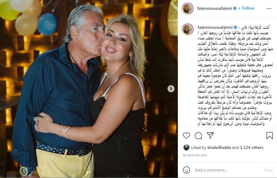 وكتبت معلقة على الصورة في بيان لها تقول: "أكدت الإعلامية فاتن موسى بأنها تلقت نبأ طلاقها غيابياً من زوجها الفنان مصطفي فهمي عن طريق المحامية سناء لحظي مساء أمس، وذلك بعد مراوغة، وهكذا علمت بالطلاق الغيابي منها ومن السوشيال ميديا وتفاجأت بالخبر تماماً مثلها مثل كل الجمهور والساحة الإعلامية ليلة أمس، وأضافت الإعلامية فاتن موسى بأنها سافرت إلى بلدها لبنان لحضور حفل خطبة شقيقتها منى التي شاركت جمهورهما ومحبيهما فيديوهات وصوراً من الحفل الذي تمّ في بيروت، رافقها شقيقها أنور الذي كان موجوداً معهما في بيتها الزوجي في القاهرة، وكان مفترض أن يرافقهما زوجها الفنان مصطفى فهمي بعد أن تمموا حجز تذاكر الطيران وكل ترتيبات السفر، إلا أنه اعتذر في اللحظة الأخيرة بعد أحداث الطيونة الأمنية التي شهدتها العاصمة بيروت مؤخراً، خصوصاً أنه كان مرتبطاً بظروف عمل وخشي من تصاعد الوضع الأمني في بيروت.
