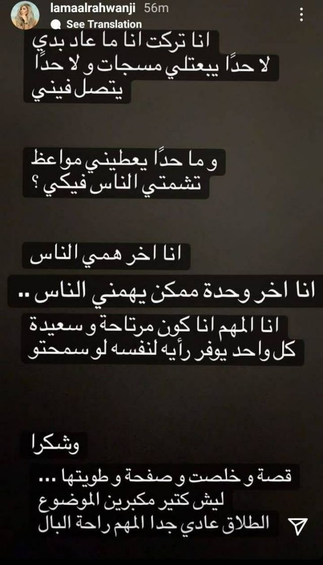 واختتمت الرهونجي منشوراتها بالقول: "قصة وخلصت وصفحة وطويتها... ليش كتير مكبرين الموضوع... الطلاق عادي جداً المهم راحة البال".