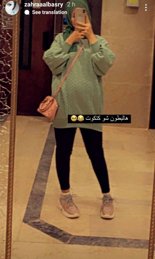 ونشرت زهراء الصورة عبر خاضية الستوريز على تطبيق انستغرام وأظهرت بطنها المنتفخة لتبدو كأنها في شهور متقدمة من الحمل، بينما أخفت وجهها بهاتفها.