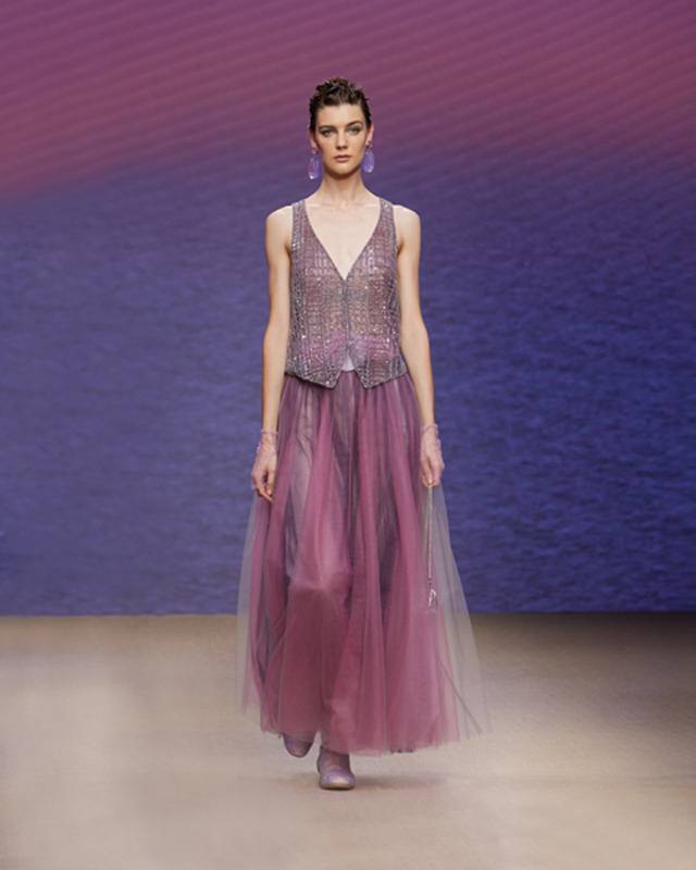 تُعتبر ملابس السهرة مأدبة احتفالية من الضوء: فساتين برّاقة ولامعة خفيفة الوزن ترسم الجسم بأناقة وبالكاد تلمسه، مصنوعة من طبقات من قماش "التول" tulle لخلق مزيجٍ من الألوان المنصهرة المدهشة والناعمة إلى أقصى الحدود.