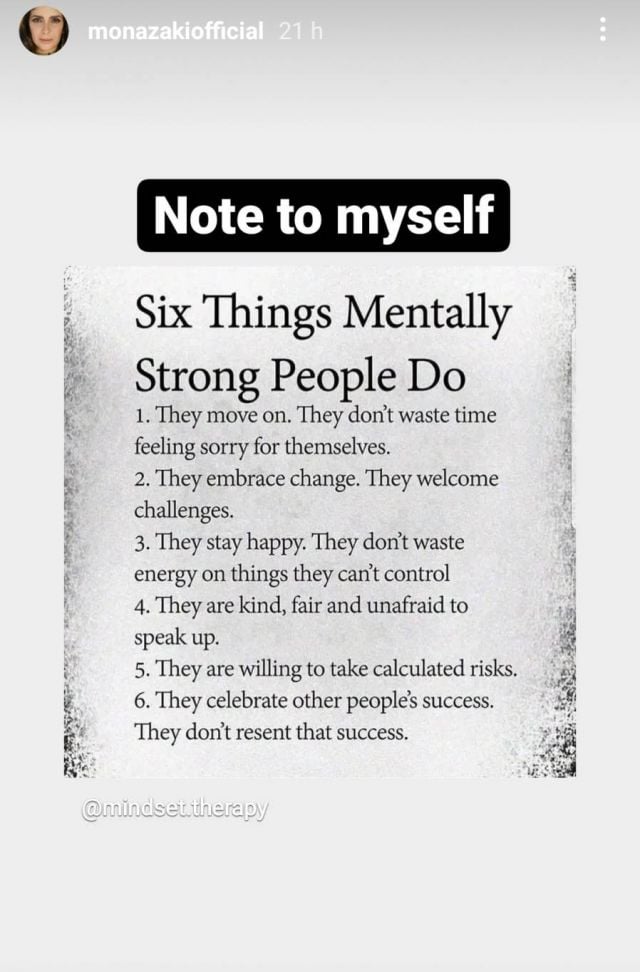 وكذلك وجهت منى لنفسها رسالة تتضمن 6 نصائح "الاذكياء الاقواء يقومون بها"، في اشارة الى انها لو تهتم للضجة الحاصلة ولا تؤثر عليها بل تعتمدها للانطلاق من جديد.
