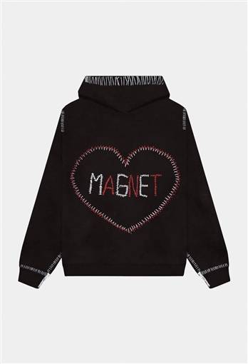 وتألق النجم المصري كعادتها بإطلالة كاجوال لفتت الأنظار وكانت حديث الشبان، حيث ارتدى "سويتشيرت" أسود كُتبت عليه من الخلف كلمة MAGNET داخل رسمة قلب، أي ترمز لمعنى "مغناطيس القلب" ومطرّز بخيوط بيضاء من الأكمام والياقة.