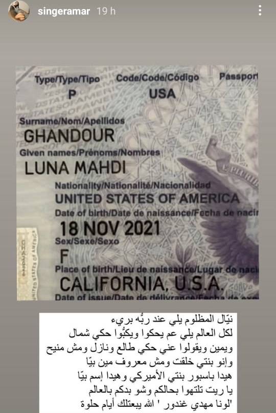 فاجأت المغنية اللبنانية قمر متابعيها على السوشيال ميديا بعرض جواز سفر ابنتها الرضيعة "لونا"، كاشفةً بذلك اسم الوالد، في محاولة للردّ على اتّهامها بالحمل من دون زواج والتشكيك في نَسب طفلتها.