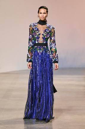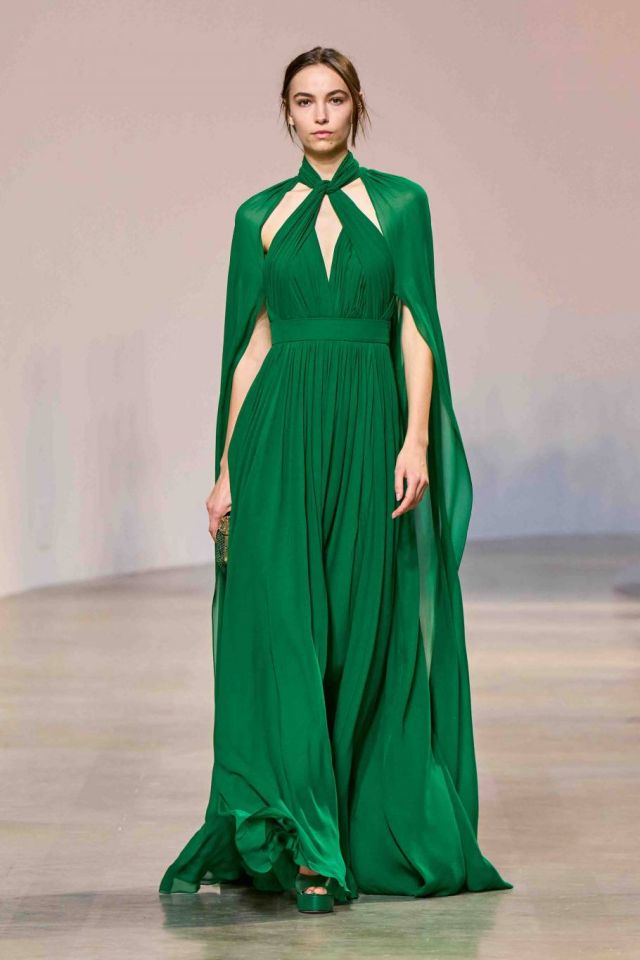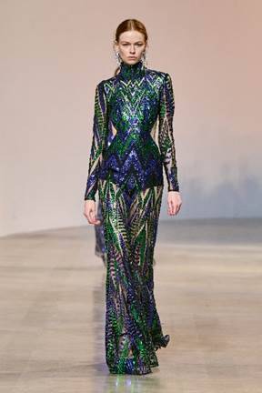 تغتني الإطلالات بالتناغمات اللونية والأنسجة الفخمة التي تعزّز الثقة والإعتداد بالنفس. وترتدي التصاميم ألوان آسرة مستمدّة من أوراق الغار الخضراء، والأرجواني الملكي والفوشيا القويّ. وتتزيّن الفساتين بالياقات المتدلّية والتفتا والثنيات التي تتفجّر عند الكتف والخصر. ويصبح المخمل الصلب والمخرّم، مادّة معتمدة في السترات الواسعة والجاكيتات المنتفخة والبنطلونات ذات القصّات الضيّقة. ويتألّق البرق مع الدانتيل المتدرّج والمكرامي في لعبة الظلّ والضوء التي يتردّد صداها في فساتين الكريب المزيّنة بالمعدن، وهو ما يعيد رسم الأجسام بأناقة.