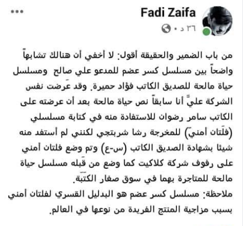 وأضاف: "من الطبيعي أن من يسرق سيناريو سيعدّل عليه وخاصة بعد ١١ عاماً على كتابته. مسلسل "حياة مالحة" بدأت تصويره في ذلك الوقت، وانسحبتِ أنتِ والسافل إياد نجار، يلي ما فيكي تصدّقي شي منه حتى اسمه، لكن أنا شفت خطوطي وشفت حالي بنص "كسر عضم"".