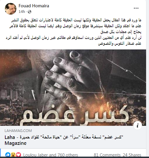 أكّد الكاتب السوري فؤاد حميرة صحة المقال الذي نشرته "لها" بعنوان ""كسر عضم" نسخة معدّلة "سراً" عن "حياة مالحة"" لفؤاد حميرة، من خلال منشورات وفيديو مباشر عبر حسابه الشخصي في موقع "فيسبوك".