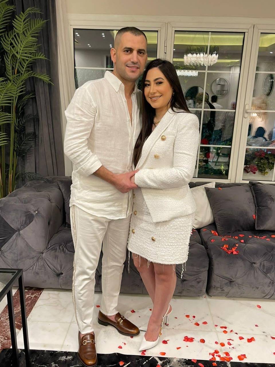 قبل ساعات من احتفال المطربة بوسي بزفافها على مصفف الشعر هشام ربيع في أحد فنادق القاهرة الكبرى، انتشرت على مواقع التواصل الاجتماعي صورة تجمع العروسين من حفل الخطوبة الذي تم في منزل بوسي وسط عائلتيهما.