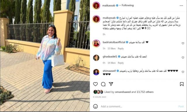 وعلقت مي على الصورة قائلة: "شكرًا من قلبي لكل حد سأل عليا ودعا لي، عملت عملية المرارة إمبارح بسلام وستر من الله.. شكرًا من قلبي لأهلي وأهل جوزي اللي دائماً شايلني.. شكرًا أصحابي وزملائي.. شكرًا جمهوري الكريم، ربنا يحفظكم جميعًا من كل شر، وألف حمد وشكر لله حمدًا كثيرًا كما ينبغي لجلال وجهه وعظيم سلطانه".