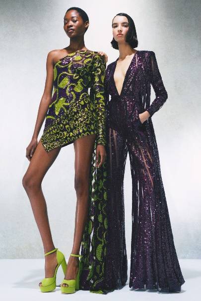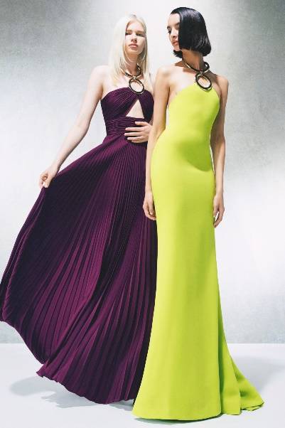 تدفّقات جريئة من الألوان والأحجام والأقمشة الفاخرة، تجتمع معاً في مجموعة متنوّعة من الإطلالات التي تترك انطباعاً مذهلاً. ألوان الأحمر الآسر والأزرق الليلي والأخضر الليموني والخزامى، تزيد من رونق الفساتين الحريرية الطويلة المتهدّلة. وتحكي التنانير والسترات الجلدية المطبّعة لغة أنيقة، تراوح بين الحضور العصري القويّ، والرومانسية المترفة. وتبرز الفخامة في الزخارف والأكسسوارات المعدنية هندسية التصاميم والجريئة، والأشرطة الكريستالية التي تزيّن ظهور فساتين الكريب.