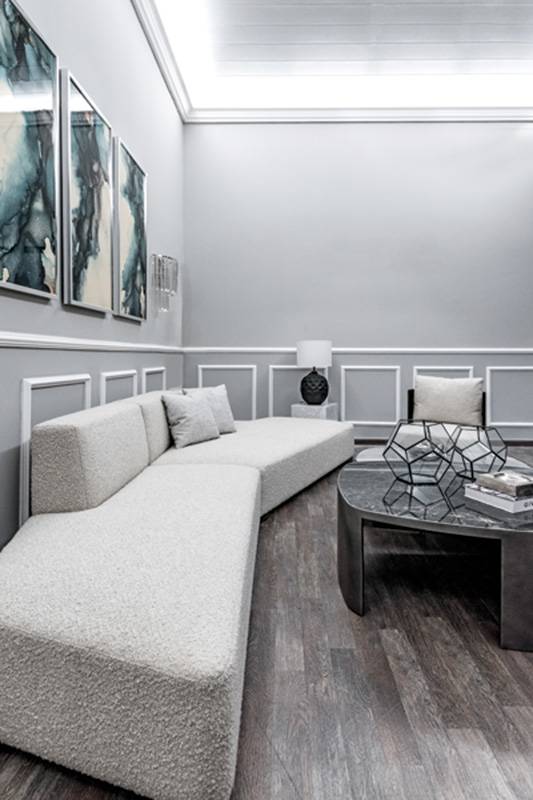 ويكون دمج الخامات بلون واحد أو بتنوع بين اللونين الرمادي والأوف وايت بين قطع الأثاث أو التنوع على قطعة الأساس الواحدة من خلال الوسائد أو البطانيات.