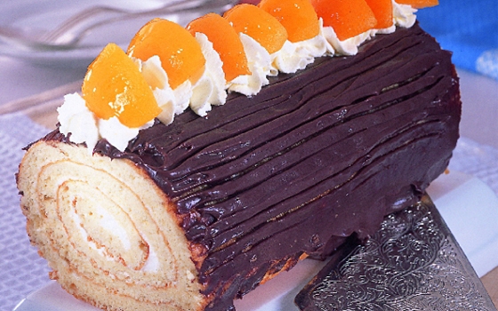 يزين الجاتوه الملفوف بقطع المشمش المعلبة والقشدة المخفوقة.