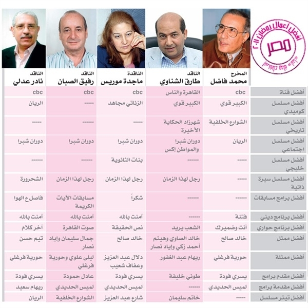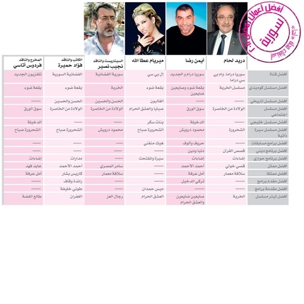 ولأنّ المنافسة تشتد عاماً بعد عام، تحرص مجلة «لها» سنوياً على متابعة أضخم هذه الإنتاجات وتسليط الضوء عليها مع نخبة من أبرز النقاد والإعلاميين والفنانين وأيضاً الجمهور لمعرفة ما هي الأعمال التي لفتت انتباه المشاهد أكثر من سواها، وليس فقط المسلسلات بمختلف فئاتها من الإجتماعي إلى الكوميدي والتاريخي والسير الذاتية، لكن أيضاً لمعرفة الشاشة الفضلى بنظرهم وأهم البرامج الحوارية وبرامج المسابقات والبرامج الدينية وغيرها. «لها» استطلعت آراء أكثر من 120 ناقداً وصحافياً وفناناً وكانت آراؤهم على الشكل التالي: