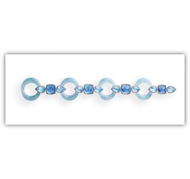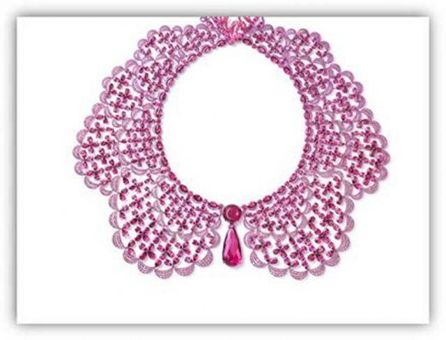 وهناك عقد مذهل من الروبليت والسافير الزهري يترك بصمة مميزة على إطلالة من ترتديه، ويبدو كياقة "كلودين" المستديرة. وبفضل زخارف تبدو كشريط دانتيل من الأحجار الكريمة بلون زهري ولمسات نهائية متناهية الدقة، تقدّم هذه التحفة البديعة لمسة عصرية وجريئة على الموضة الكلاسيكية. وبالمثل، رصّع زوج من الأقراط بإجمالي 35 قيراطاً من الألماس كمثري القطع الذي زيّن دلايات طويلة ليعزز من فخامة الأقراط.