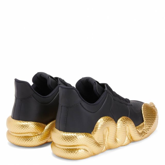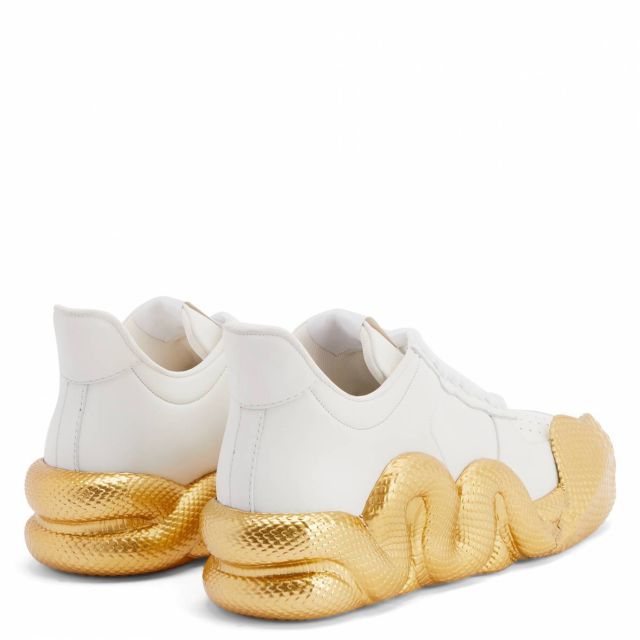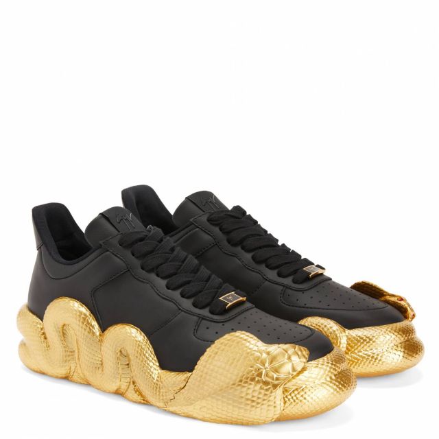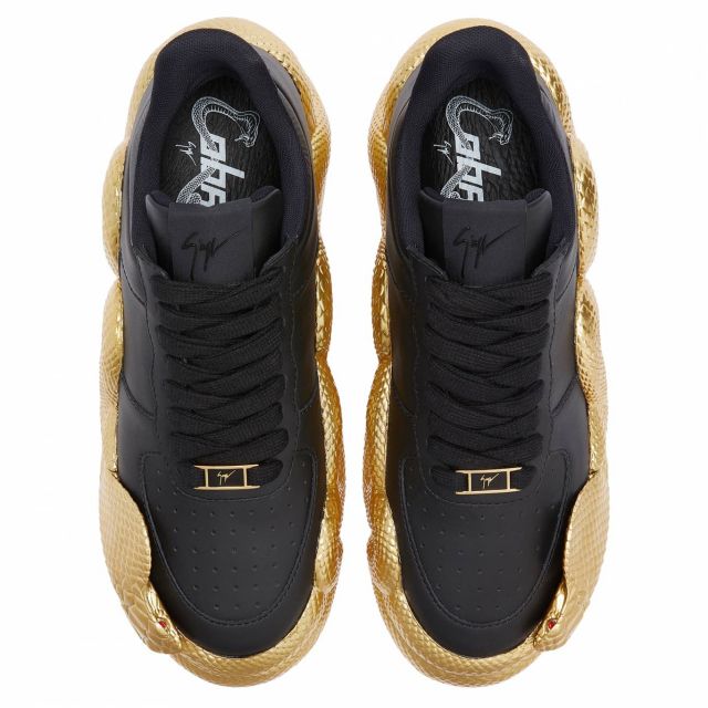 صُنعِت أحذية كوبرا الجديدة من الجلد الأبيض أو الأسود، يتداخل معه لون ذهبي، وهي متوافرة الآن في مجموعة مختارة من متاجر التجزئة الفاخرة ومتاجر جيوسيبي زانوتي وعلى موقع giuseppezanotti.com