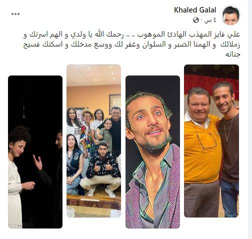 وأعلن خالد جلال، من خلال تعليقه على الصور خبراً مفجعاً بوفاة الفنان المصري الشاب بشكل مفاجئ قائلاً: "علي فايز المهذب الهادئ الموهوب.. رحمك الله يا ولدي وألهم أسرتك وزملاءك، وألهمنا الصبر والسلوان وغفرلك ووسع مدخلك، وأسكنك فسيح جناته".