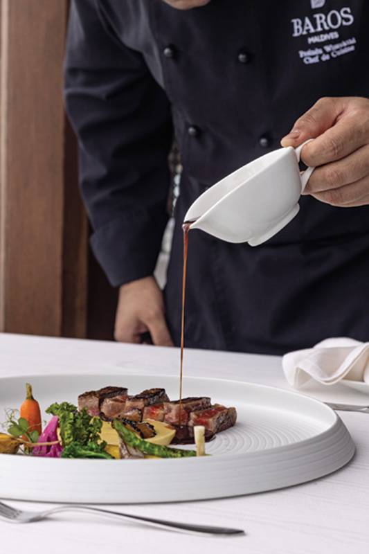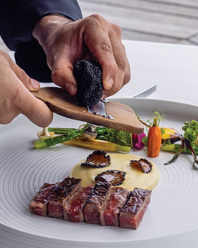 لحم بقر "كوبي" محمّر بالمقلاة، بطاطا وكمأة مهروسة، خضروات موسمية، أوراق من الملفوف الأخضر الطازج (كيل)، عُصارة اللحم المدخّن.