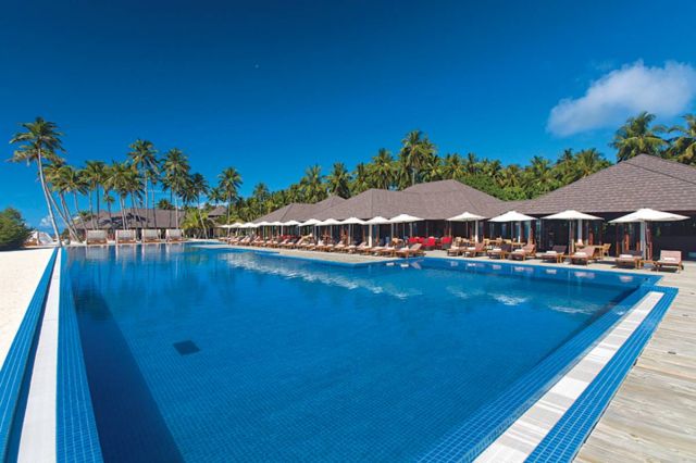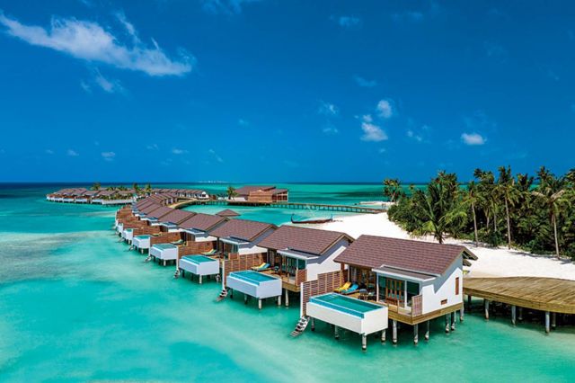 * فيلا الغروب المائية مع مسبح Sunset Water Villa With Pool: هذه الفيلات موجودة في شمال الجزيرة وهي عنوان الفخامة المطلقة مع تراس خشبي أنيق ومسبح خاص وديكور داخلي عصري ومميز. يستمتع نزلاء هذه الفيلا بأرضيات زجاجية في غرفة النوم والحمام تتيح لهم الاستمتاع برؤية الأسماك وهي تسبح في المحيط، ويستفيدون من ميني بار مجاني يعاد ملؤه كل يوم، وآلات لصنع الشاي والقهوة.