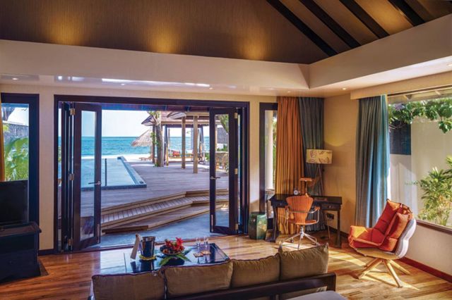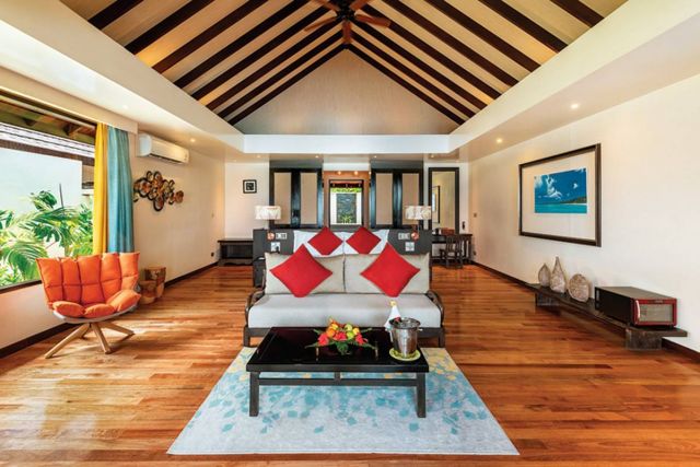 * الفيلا المائية Water Villa: مثالية لعطلة رومنسية أو شهر عسل مميز لاسيما وأنها تقع في الطرف الغربي من الجزيرة وتوفر عزلة مثالية. يستمتع نزلاء هذه الفيلا بأرضيات زجاجية في غرفة النوم والحمام تتيح لهم الاستمتاع برؤية الأسماك وهي تسبح في المحيط. كما يحظى نزلاء الفيلا المائية بميني بار مجاني يعاد ملؤه كل يوم، وآلات لصنع الشاي والقهوة، إضافة إلى تراس خارجي فوق الماء يتيح الاستمتاع بروعة المياه الفيروزية وأشعة الشمس الذهبية.