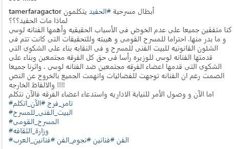 وكتب تامر منشوراً قال فيه: "أبطال مسرحية الحفيد يتكلمون.. لماذا مات الحفيد؟ كنا متفقين جميعًا على عدم الخوض في الأسباب الحقيقية وأهمها الفنانة لوسي وما بدر منها.. احترامًا للمسرح القومي وهيبته وللتحقيقات التي كانت تتم في الشئون القانونية للبيت الفني للمسرح وفي النقابة بناء على الشكوى التي قدمتها الفنانة لوسي للوزيرة رأسًا في حق كل الفرقة مجتمعين".