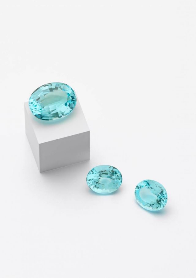 ونظراً لوجود النحاس في تربة منطقة شمال موزمبيق، استُخرج منها أخيراً بعض من أجود أنواع التورمالين بألوان تتراوح ما بين الأزرق الخالص إلى الأزرق المخضرّ، والتي تشبه إلى حد بعيد تورمالين "بارايبا" الشهير الذي استُخرج في البرازيل خلال الثمانينيات ثم استُخرج لاحقاً في نيجيريا. ولذلك يمكن اعتبار تجميع مثل هذه المجموعة من التورمالين الموزامبيقي بهذا اللون والحجم والجودة بمثابة فرصة استثنائية. ومن جهة أخرى، سيتم تسليط الضوء على الحجر الثالث الذي يعادل وزنه 16 قيراطاً من خلال ترصيعه على خاتم ذي تصميم مطابق لتصميم الأقراط لصنع نصف طقم بجاذبية ساحرة.