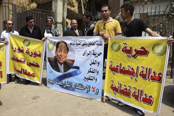 وفي المقابل نظم عدد من المتضامنين مع «الزعيم» وقفة احتجاجية أمام مقر المحكمة، ورفعوا لافتات كتبوا عليها، «لا لاحتكار الفن المصري بعد اليوم»، وغاب عن الوقفة التضامنية الفنانون وحضر فقط الفنان سامح الصريطي، الذي حرص على حضور الجلسة والاستماع إلى المرافعة وانتظار الحكم.
