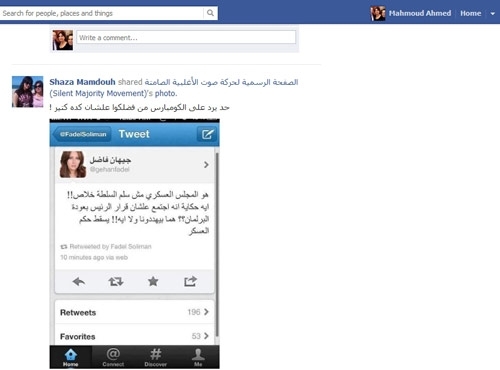 كانت شذى قد نشرت على الفيسبوك صورة لصفحة جيهان فاضل من موقع تويتر وهي مغردة فيه، قائلة: «المجلس العسكري قام بتسليم السلطة، فما هي حكاية اجتماعه لمناقشة قرار الرئيس بعودة البرلمان؟؟ هما بيهددونا ولا إيه؟؟ يسقط حكم العسكر».