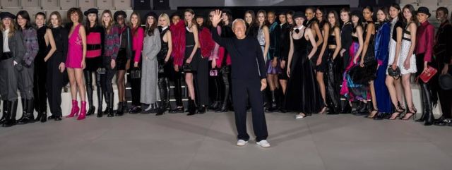 قبّعات صغيرة، وسترات بأزرار غير متماثلة، وقمصان مسائية ذات أشرطة مزوّدة بأحزمة كبيرة تذكّرنا بملابس المسرح، ملابس يتمّ اختيارها بعين أرماني الفنيّة المميزة. المجموعة رشيقة وخفيفة: ملابس تضفي حوافها القصيرة رشاقة على الحالة المزاجية، مقترنة بأحذية ذات نغمات غرافيكية في تناوب فاتن مع بنطلون انسيابي. الصورة الظلّية دقيقة وجذابة، مع أكتاف وخصر يتم تحديدهما بأناقة بواسطة أحزمة عالية. التفاعل المشترك بين المذكّر والمؤنث متأصل تعكسه الجينات الإبداعية بوضوح، يتم التعبير عنه وعرضه من خلال الأحجام والأنسجة، أسطح لامعة في عناق مع الموهير والأقمشة والمخمل المنسوج، في مزيج من الأسود والأبيض والرمادي ولمسات من اللون الأرجواني القوي والإشراق المعدني. الملابس والإكسسوارات تلبّي كل إطلالات ومناسبات النهار والمساء: جاكيتات منفوخة مخملية منقوشة، حقائب كبيرة يزيّنها الترتر، طوق القميص كقلادة على فستان السهرة. تماماً كما على المسرح، تعود كل العناصر للظهور، كلاسيكية غير عادية تتألق بتميّز تحت الأضواء.