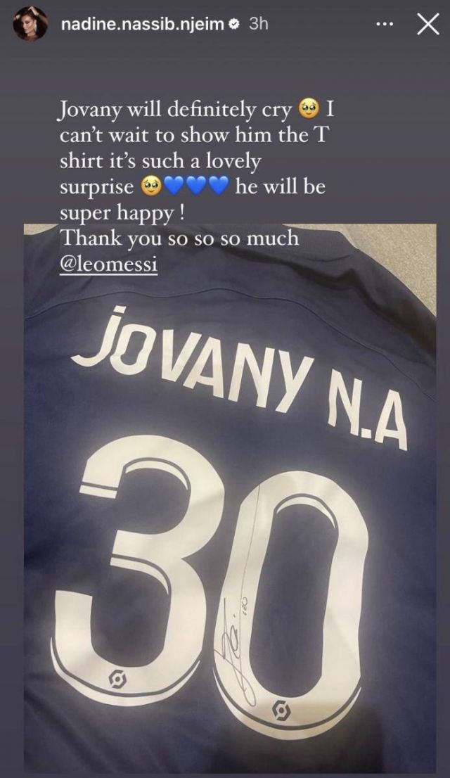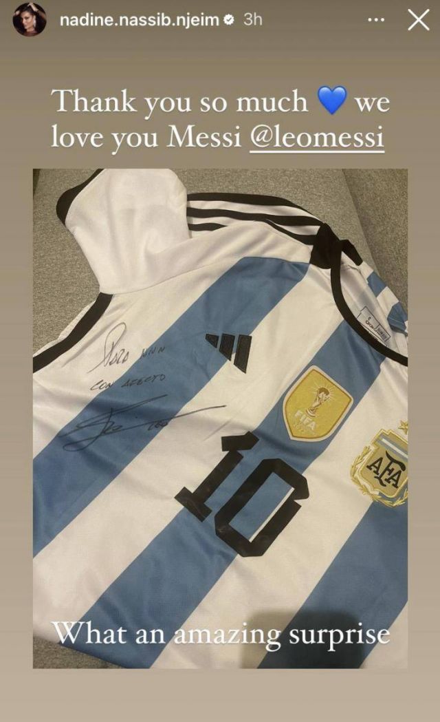 كذلك حصل جيوفاني، ابن نادين على قميص خاص له يحمل الرقم 30 وموقّع من ميسي. وأرفقت الصورة التي نشرتها عبر خاصية الستوريز بتعليق كتبت فيه: "جوفاني بالتأكيد سوف يبكي، لا أستطيع الانتظار لكي أقدّم له التيشريت، يا لها من مفاجأة، سيكون سعيداً جداً، شكراً جزيلاً ليونيل ميسي".
