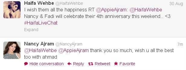 "نانسي وفادي يحتفلان بعيد زواجهما الرابع، تهانيّ لهما، أتمنى لهما دوام السعادة" هذا ما كتبته الفنانة اللبنانية هيفا وهبي على صفحتها على تويتر. وردّت نانسي التغريدة بأخرى مماثلة وقالت " شكراً جزيلاً هيفا، أتمنى الأفضل دائماً لك ولزوجك أحمد".