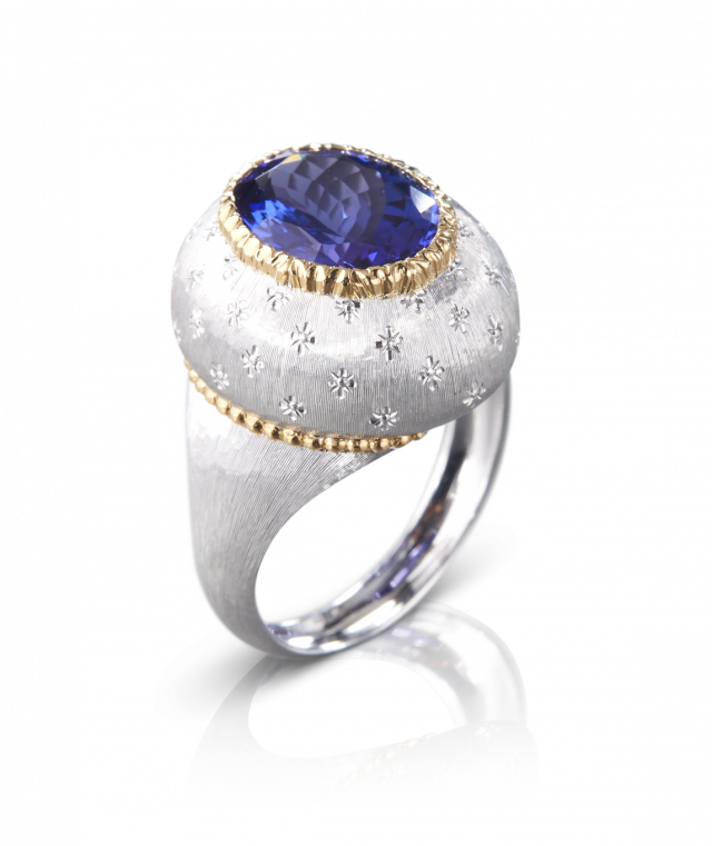كانت نيته ابتكار جوهرة ساحرة، تُعتبر بمثابة أسمى درجات التكريم للتقليد الفريد لصائغ الذهب لدار بوتشيلاتي Buccellati، مع التركيز بشكل خاص على تقنيات النقش. لذلك، جاءت ابتكاراته قطعاً من المجوهرات ذات سحر فريد، وقد تمكن من تكرار التأثير القزحي الساحر الذي يحاكي الحرير على سطح الذهب. يتم الحصول على هذا التأثير الحريري الفريد من خلال نقش "ريغاتو- rigato" النموذجي: العديد من الخطوط المتوازية الصغيرة والرفيعة المصنوعة من النحت المجهري الدقيق الذي يخلق نسيجًا ذات لمعان مذهل. بالإضافة، تمّ تزيين المنحوتات الناعمة التي تشكلّ الحواف بنقوش دقيقة للغاية من زخارف " أورناتو- ornato".