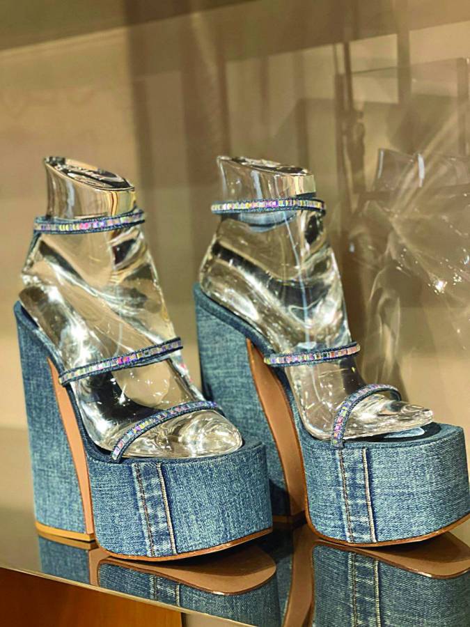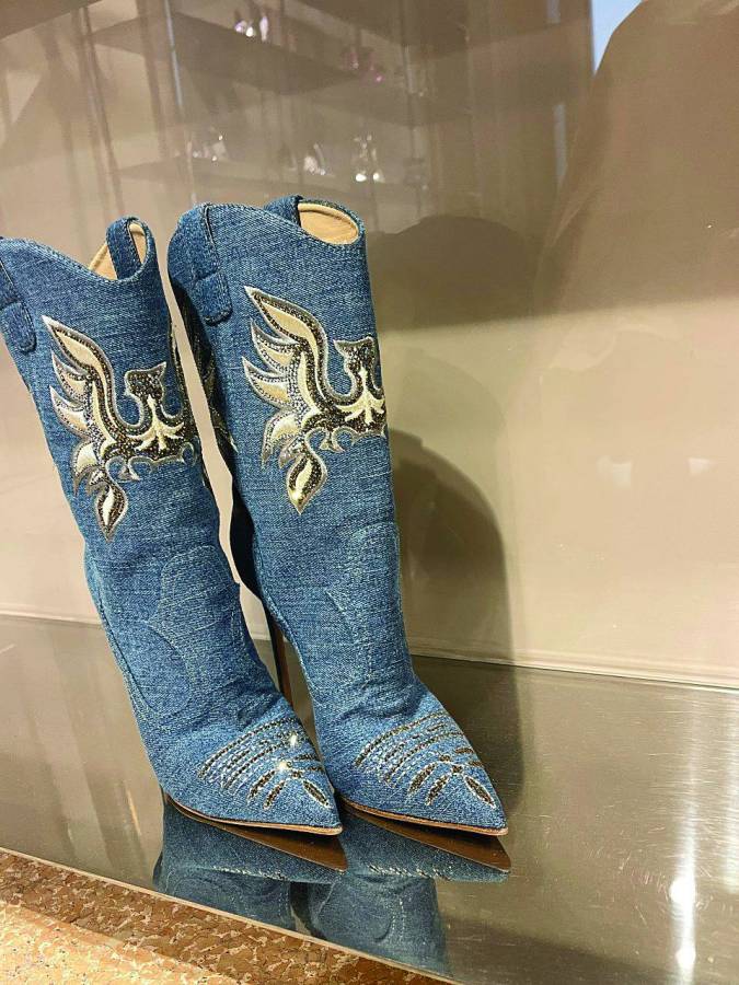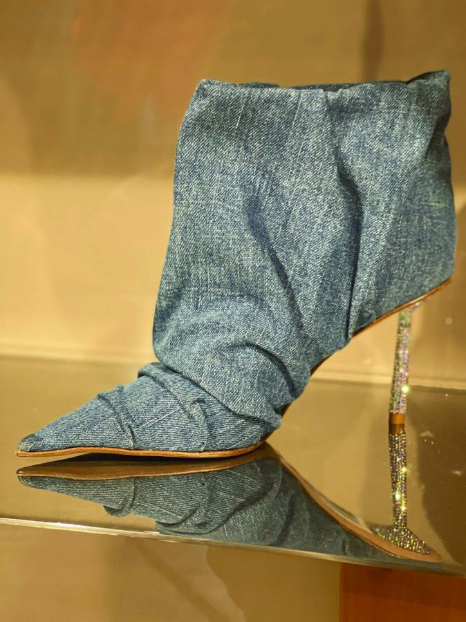 وقدمت العلامات التجاريّة المرموقة هذا العام أحذية وحقائب من الدنيم وتنوعت بتصاميمها الفخمة والمختلفة، فعرضت الجزمات العالية البسيطة والمصنوعة من قماش الدنيم، وجاء بعضها بسلاسل من الكريستال.