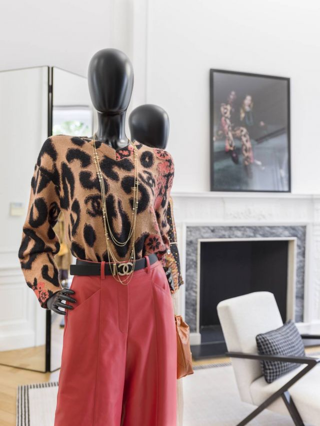 يطغى على المفروشات اللون البيج الذهبي، إضافة إلى الأثاث المنجّد باللون الوردي النابض بالحياة والتويد الأخضر. يؤدي درج عريض إلى الطابق الأول إذ تم تحويل غرفة الطعام ذات السقف الجداري إلى مساحة للملابس. النوافذ الكبيرة تتحدث عن الثقافة والعيش المشترك. وتضم الغرف المجاورة مجموعة الأحذية مع غرفة كبيرة للأكسسوارات والساعات، والمجوهرات الراقية والملابس الجاهزة.
