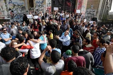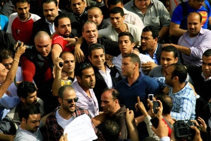 وتجمع المئات من المؤيدين لباسم يوسف لدعمه، ورددوا هتافات ينددون فيها بمحاولات قمع حرية الإعلام.
