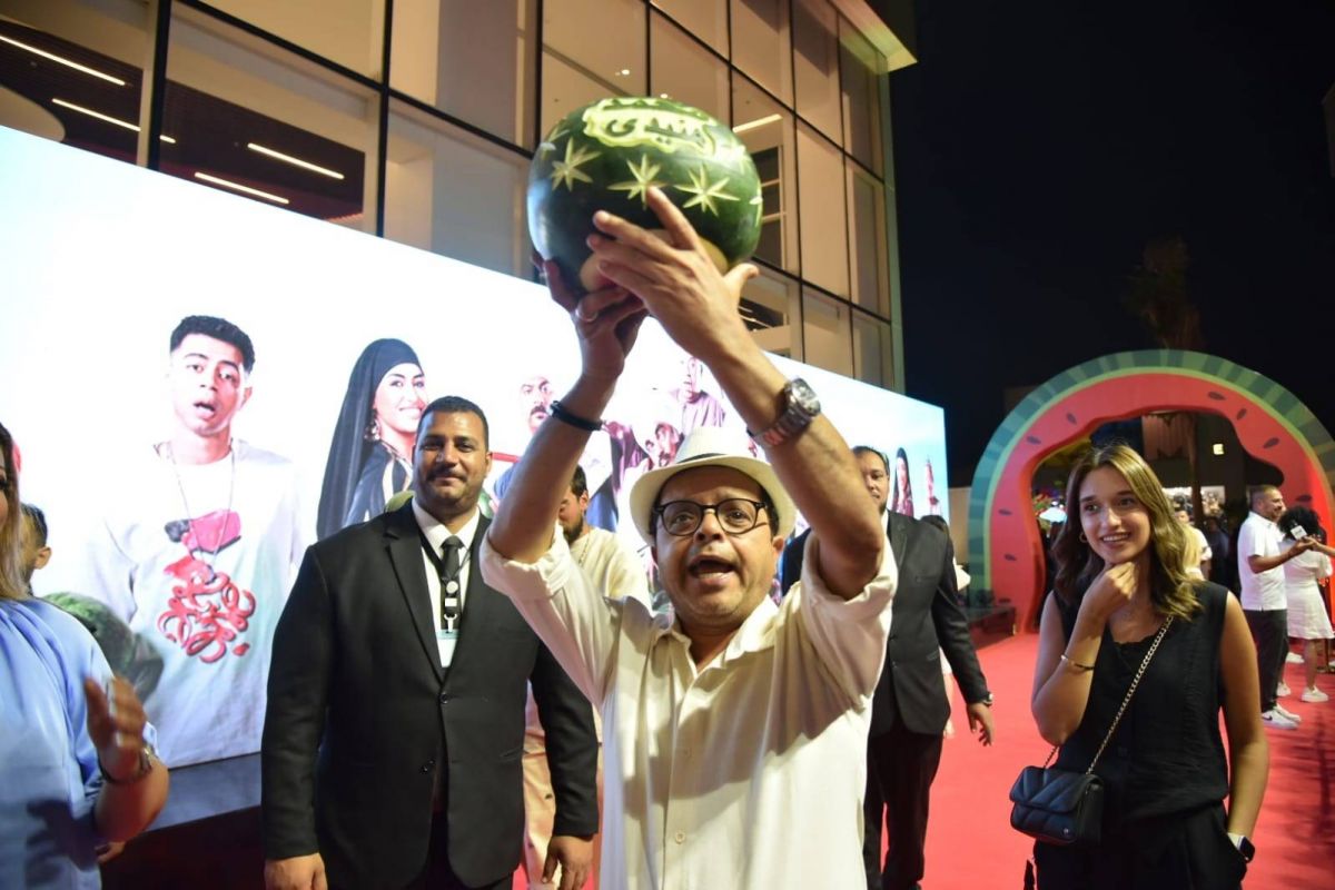 محمد هنيدي يحمل بطيخة عليها اسمه في العرض الخاص لـ مرعي البريمو