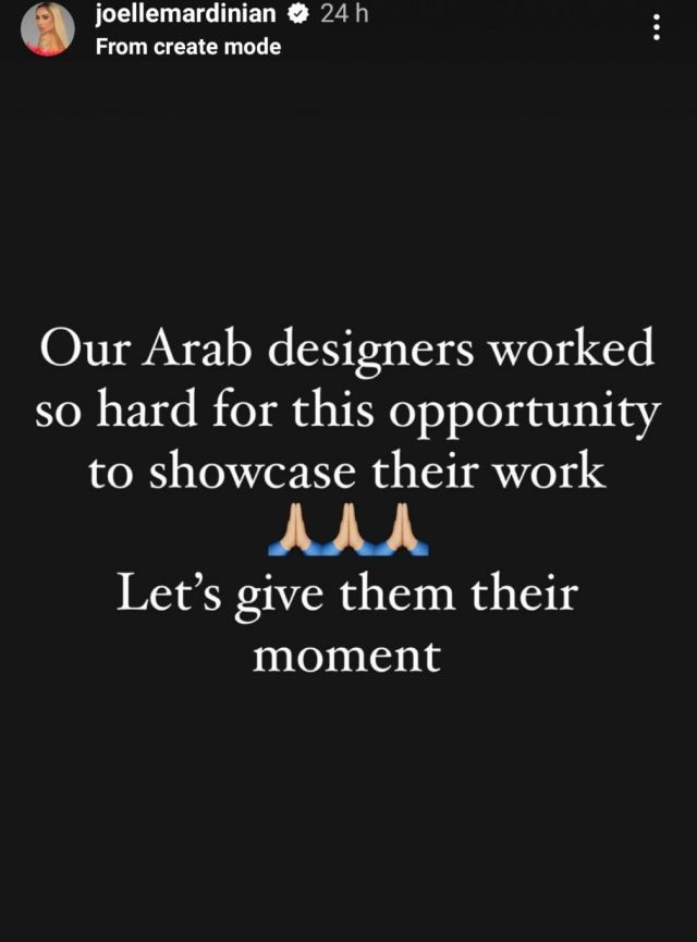 وتحرص جويل على التعبير عن حزنها وامتعاضها مما يحصل عبر خاصية الستوريز على انستغرام من خلال منشورات خاصة، ولكنها قدمت أخيراً اعتذارها من متابعيها بسبب إقدامها على نشر بعض الصور الخاصة بعروض الأزياء والموضة، لافتة الى ان مصممي الأزياء العرب عملوا بجهد لإتمام مجموعاتهم ومن حقهم أن يتم الترويج لهم ودعمهم رغم كل الظروف.
